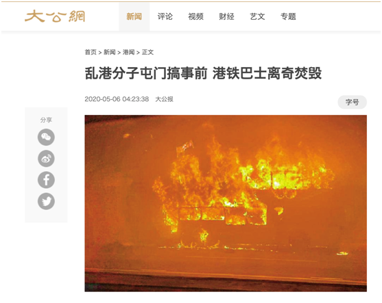 5日傍晚,香港屯门。一辆双层巴士不知道为什么突然燃起熊熊烈火。所幸没有人在车上。