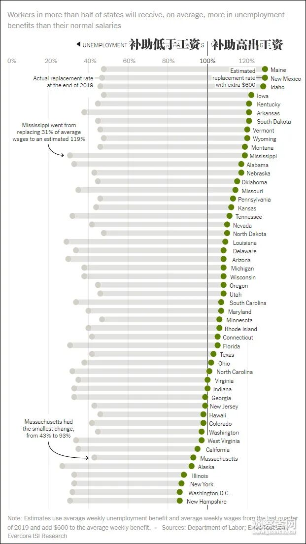 美国的一家研究公司4月23日数据显示,全美36个州的失业补助金要高于居民的平均收入;10个州的失业补助金额是居民工资的120%;失业补助占比最低为新罕布什尔州,但补助占工资比重也超过了80%。