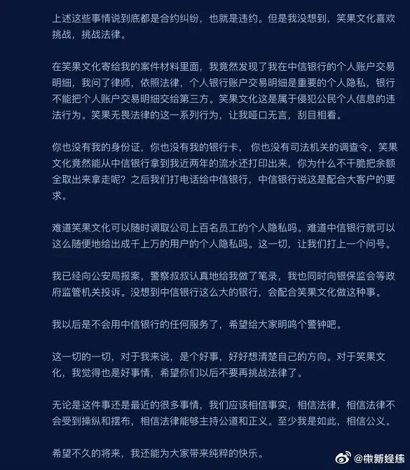 5月5日,脱口秀演员池子发长文起诉笑果文化侵权,称在经纪合约纠纷案中,笑果文化寄给他的材料含有他的银行的个人账户交易明细,属于侵犯公民个人信息。
