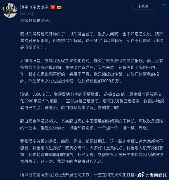 这本来是一场艺人跟公司打官司的事,在娱乐圈很常见,大家司空见惯了,我们也没有兴趣去关注池子与笑果文化谁去谁错。