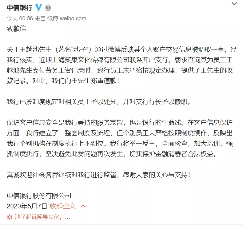今天凌晨,中信方面做出回应,向池子道歉,承认员工未严格按照规定办理,并对支行行长予以撤职。