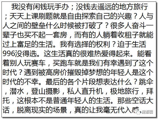 “如果以后要是真的天天能赚300块钱了,我就带我姑父去旅旅游……”今天看到一个视频,一个能代表大多数年轻人的“后浪”。视频中,灰头土脸的工人,在镜头面前絮絮叨叨地畅想着自己天天赚300块钱之后的愿望:带养育自己长大的姑父去北京、西安、海南、西藏等地方旅游,吃当地的美食,带他去坐飞机、高铁、轮船……笑着说到最后,忽然意识到现实生活的情况,只能笑着无奈叹息:哎呀这就是这么想的。对于他来说,未来能不能每天挣到300块钱是个未知数。也许是受到疫情的影响,也许是因为行业形势的影响,他最近都不加班了。对于普通工人来说,不加班的话,一个月的工资也就是三、四千块,每天一百多。这样的工资水平,其实无论是在哪个城市,除去每个月的生活费、房租等,根本存不下什么钱。因此,他们最直接、朴素的想法就是“多加加班,多挣点钱”。而且,要实现这个愿望,除了挣更多的钱这个条件,还需要放弃他与女朋友去云南大理这些浪漫的地方旅游的计划。有时候,为了实现一个小小的愿望,不得不放弃其他的选择,甚至放弃各种选择之后依然没有办法达成愿望。这是大多数普通年轻人的宿影,是真正的“后浪”的生活。《后浪》里年轻人的生活,只是现实中大部分年轻人追求的理想。《后浪》里描述的种种年轻人的生活,很多是我们普通人奋斗一生都未必能够达成的理想。比如《后浪》中,年轻人用一套一万多块的iPad Pro和Apple Pencil去学习。现实却是,很多人连智能手机都用不起,在疫情的之下,孩子连网课都上不了。《后浪》中,后浪可以从小就自由探索自己的兴趣,在童年进入不惑之年,不惑与自己喜欢什么,不喜欢什么。现实是,很多孩子在童年的时候能探索的只有一堆黄土和泥沙。《后浪》中的年轻人,他们可以选择用一套好几万的单反和稳定器,玩从几百到几千的高达模型,开高性能赛车,到国外滑雪潜水跳伞漂流,去南极探险……可是,这只是极少数的一部分人才拥有的自由选择、探索的权利。为了生活、还房贷,不得不选择996的生活,没有时间和钱去探索这个世界的精彩。就像开头那个普通的年轻人,为了带姑父在国内旅游,要加班挣钱,要放弃与女朋友旅行的计划。甚至最后,还要放弃自己个人的“终身大事”,因为“缺钱还多着呢”,挣不了彩礼,买不起房子。《后浪》中年轻人的生活,只是现实中大部分年轻人追求的理想。理想不是生活,这也是很多年轻人反感《后浪》的原因。极少部分人的生活、大部分人的理想,却被B站混淆、模糊成了大部分人的生活。真正的“后浪”,他们通常脸上有灰,眼里有光,心中有梦。正是因为心中有理想,即使现在的生活没有选择、过的很艰难,他们也依然在各自的领域努力着、奋斗着。比如,即使没有存在感,却会为了更好完成工作而天天加班的实验室测试员:比如,未来保家卫国而辛苦训练、不能时时陪伴家人的特警们:比如,为了考上好大学、报效祖国而整天读书,被嘲笑书呆子的学生:比如,菜市场上一边工作一边辅导孩子上网课的小商贩:比如,即使在案板下这样逼仄的环境下学习,依然乐观、刻苦学习的孩子:这些真正的后浪,即使经历现实的种种打击、挫折,依然可以在他们眼中看到星光,看到希望。这比《后浪》中激昂地叫嚣着的“心里有火,眼里有光”更加真切、动人。《后浪》这个短片,就像是大人炒热孩子吃披萨的气氛却没有给孩子披萨一样,不过是空谈,给后浪打鸡血而已。于是,后台有人问,我是太过于理性的残忍还是不相信理想的犬儒?理性的残忍也好,不相信理想的犬儒也罢,这些其实并不重要。《后浪》中年轻人的生活是我们的理想,而且我们知道,可能我们工作一辈子也不可能过上那样的生活。但是,这并不妨碍我们一直为了过上那样的生活、为了让我们的孩子过上那样的生活,而苦逼地工作着。一个是向往的生活,一个是真实的生活,我们要仰望星空,更要脚踏实地。