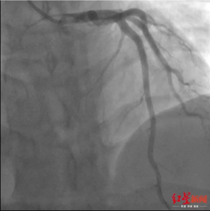 进行紧急冠脉造影,造影结果显示,原本应该粗大明显的冠脉血管前降支的显影只剩下1厘米左右。“前降支被堵死了!”