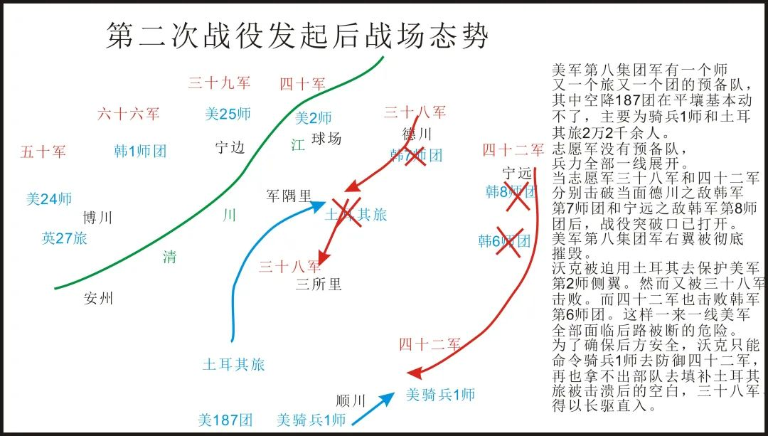 沃克虽然命令英军第27旅紧急回援,但已然来不及了。三十八军打垮土耳其旅后,在没有阻拦的情况下穿插至三所里,切断了美军王牌第2师的后路。
