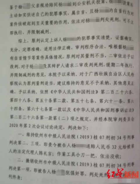 2020年3月25日,二审广西壮族自治区高级人民法院决定撤销一审法院关于杨光毅的剥夺政治权利终身、判处死刑的宣判。