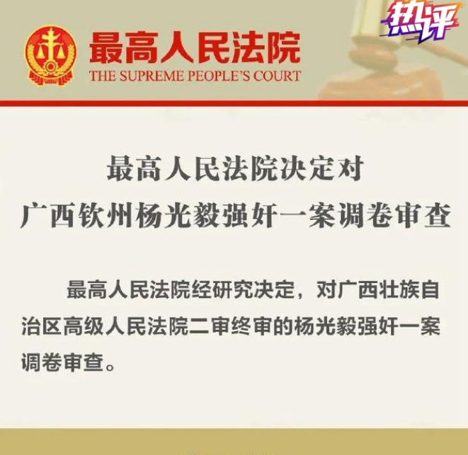 今天,最高人民法院已经决定对广西壮族自治区高级人民法院二审终审的杨光毅强奸一案调卷审查。