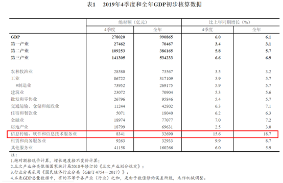 下图是国家统计局发布的2019年全国GDP分产业的增长情况,可以看出信息传输,软件和信息技术服务业达到3.269万亿元,增长了15.6%,远远快于GDP总体6.1%的增速。