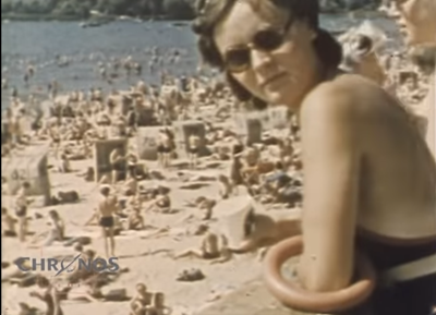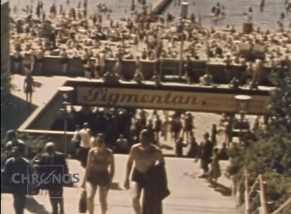 市民的衣着已经有了专门的泳衣,河边修筑的台阶和栏杆的样式已经和今天没什么两样了,河边游泳的游人人数众多。我觉得即使是从今天穿越到当时的万湖边去游泳,不会有任何穿越感。