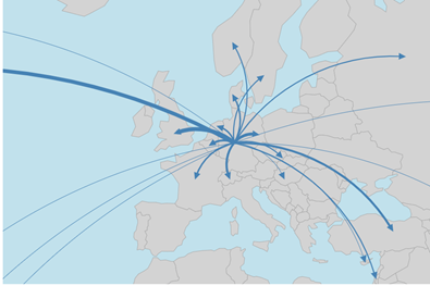 下图为从1933年开始从德国逃亡其他国家的物理学家的去向,去的人数越多,箭头越粗,显而易见去英美两国的最多,这极大的加强了英美两国的物理学进展,图片来源:Greg Stasiewicz