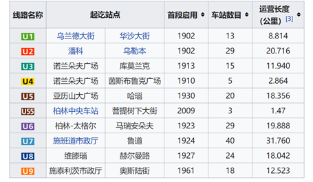 进一步查询了柏林地铁各条线路的通车时间,柏林在2020年的今天总共有10条地铁线路,