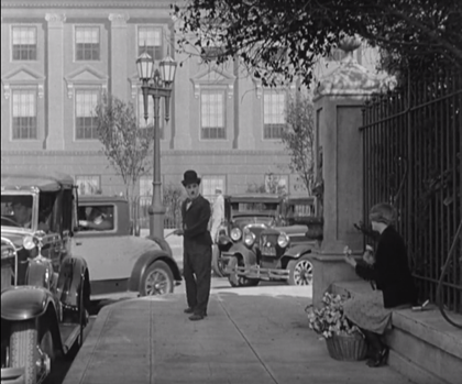 这个电影在1928年12月—1930年9月拍摄完毕,电影中的纽约已经高度繁华,下图是夏尔洛和卖花姑娘第一次相遇的地方,车辆川流不息,地面和路旁的台阶整洁干净。