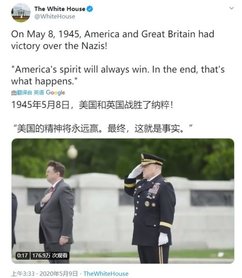在他们嘴里,德国法西斯是他们消灭的,世界和平是他们守护的,5月8日,美国白宫的推特账号也在5月8日发推纪念二战胜利,却闭口不提苏联的贡献。“1945年5月8日,美国与英国赢得了对纳粹德国的胜利!美国精神永远会胜利,到最后,就是这么回事。”