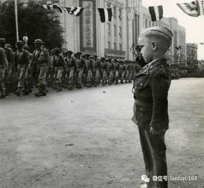 一名美国小孩向美国老兵游行队伍敬礼
