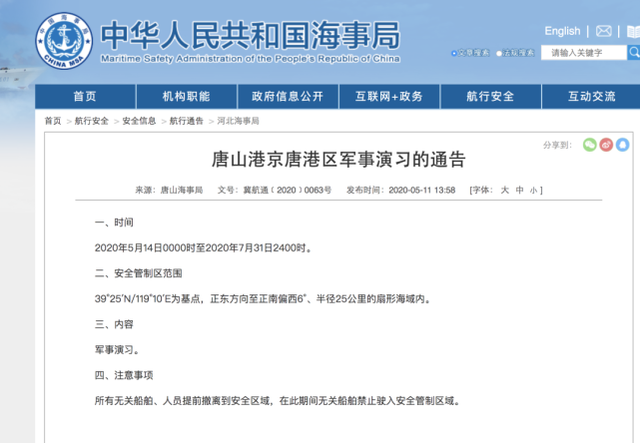 5月11日,国家海事局官网发布《唐山港京唐港区军事演习的通告》(文号:冀航通﹝2020﹞0063号)。通告称,2020年5月14日零时至2020年7月31日24时,所有无关船舶、人员提前撤离到安全区域,在此期间无关船舶禁止驶入安全管制区域。该安全管制区范围:39°25′N/119°10′E为基点,正东方向至正南偏西6°、半径25公里的扇形海域内。