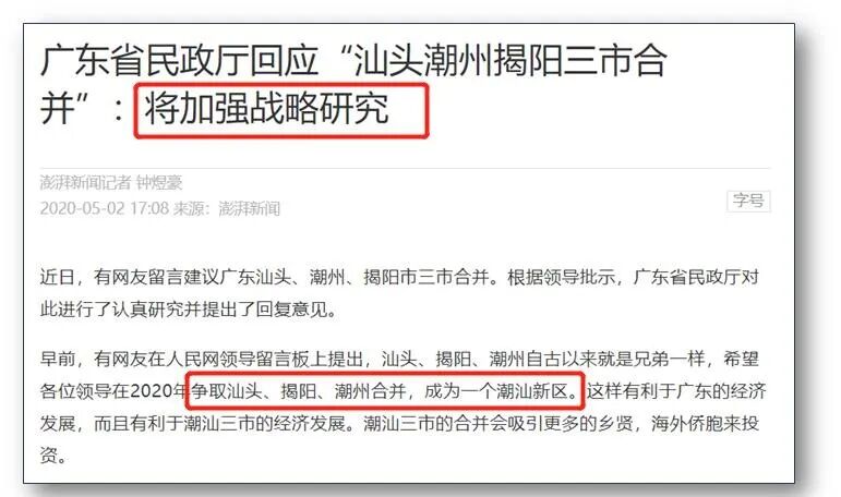 近日,广东省民政厅在回复网友关于“汕头、揭阳、潮州合并,成为一个潮汕新区”的建议时表示: