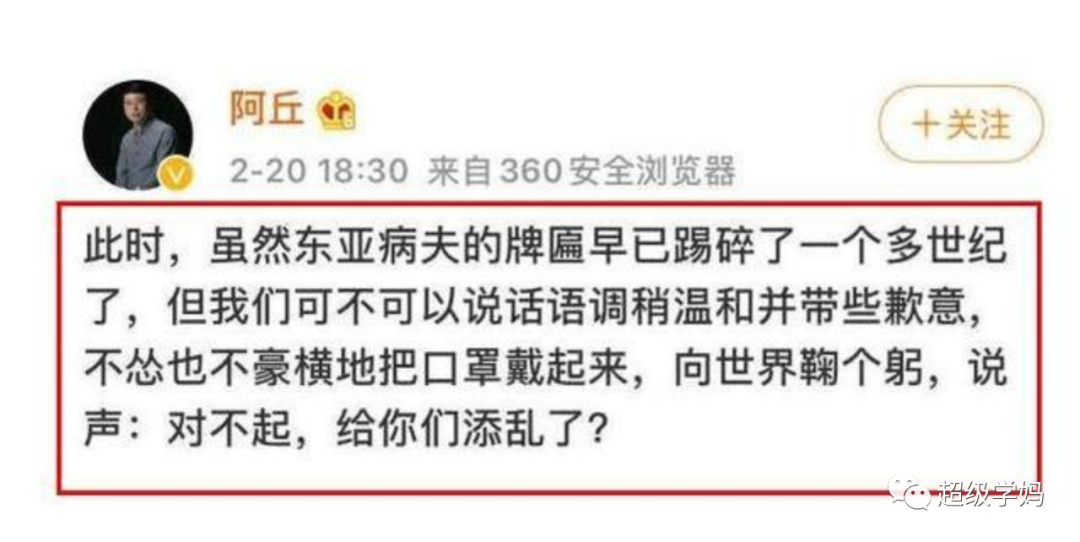那么问题来了,在武汉最困难的时候,在中国最困难的时候,央视名嘴阿丘就逼逼着说,中国欠整个世界一个道歉。现在他是不是应该站出来,给中国人民一个道歉?