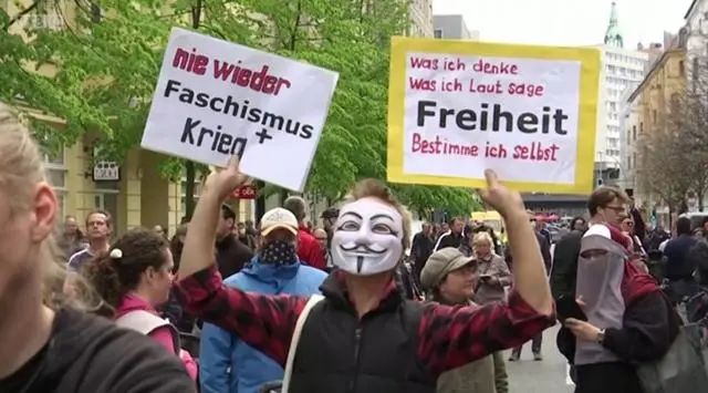 对于有中央集权ptsd的德国人来说,一个口罩强制令也是可以和法西斯划等号的。柏林的抗议游行打出“法西斯主义和战争永远别回来”以及“我要自己决定”的口号