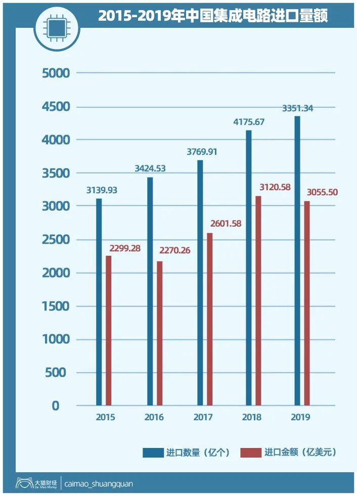 前两年,我们每年都得花3000多亿美元买芯片,要知道同期我们进口石油花了2400亿左右,芯片已经超越石油,成为我们花费最大的战略性物资。