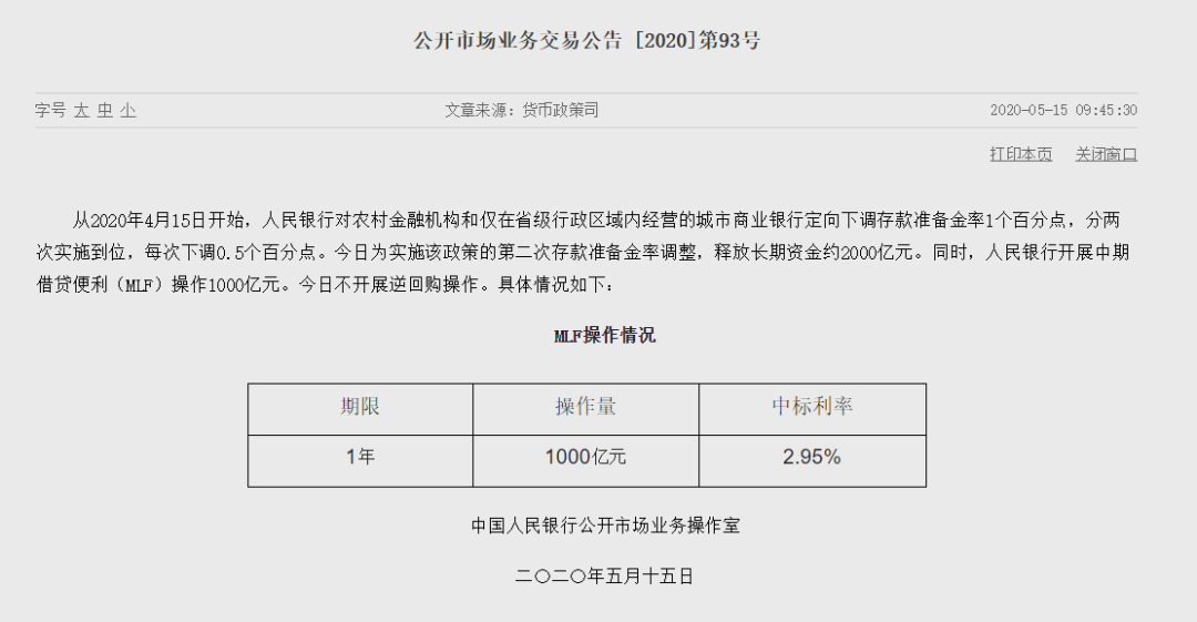 每月的20日(工作日顺延),是LPR(贷款市场报价利率)调整的时间窗口。5月20日(下周三)即将到来,市场一直在猜测,央行会不会再次降息。一是蔡英文将发表就职演说,开启新一轮任期,这个讲话会严重影响两岸关系。尤其在中美博弈加剧,美国拉着台湾操弄WHA问题的时候。二是“两会”即将召开,5月21日政协开幕,5月22日人大开幕。一般预测,两会将有重磅经济政策出台。从历史惯例看,在两会期间央行、证监会会有一些利好,稳定会议期间的股市。也就是说,从历史经验看:5月20日应该有较大概率降息。虽然4月20日,央行曾降息20个基点,力度已经非常大了。对于LPR利率来说,中期借贷便利(MLF)1年期利率,是最重要的参考。5月14日,本来有2000亿的1年期MLF到期,是央行非常好的“引导LPR”的时间窗口。但5月14日央行按兵不动,没有续作到期的MLF。而到了今天(5月15日),突然宣布发起1000亿的1年期MLF,利率维持在2.95%,跟4月15日的利率相同。