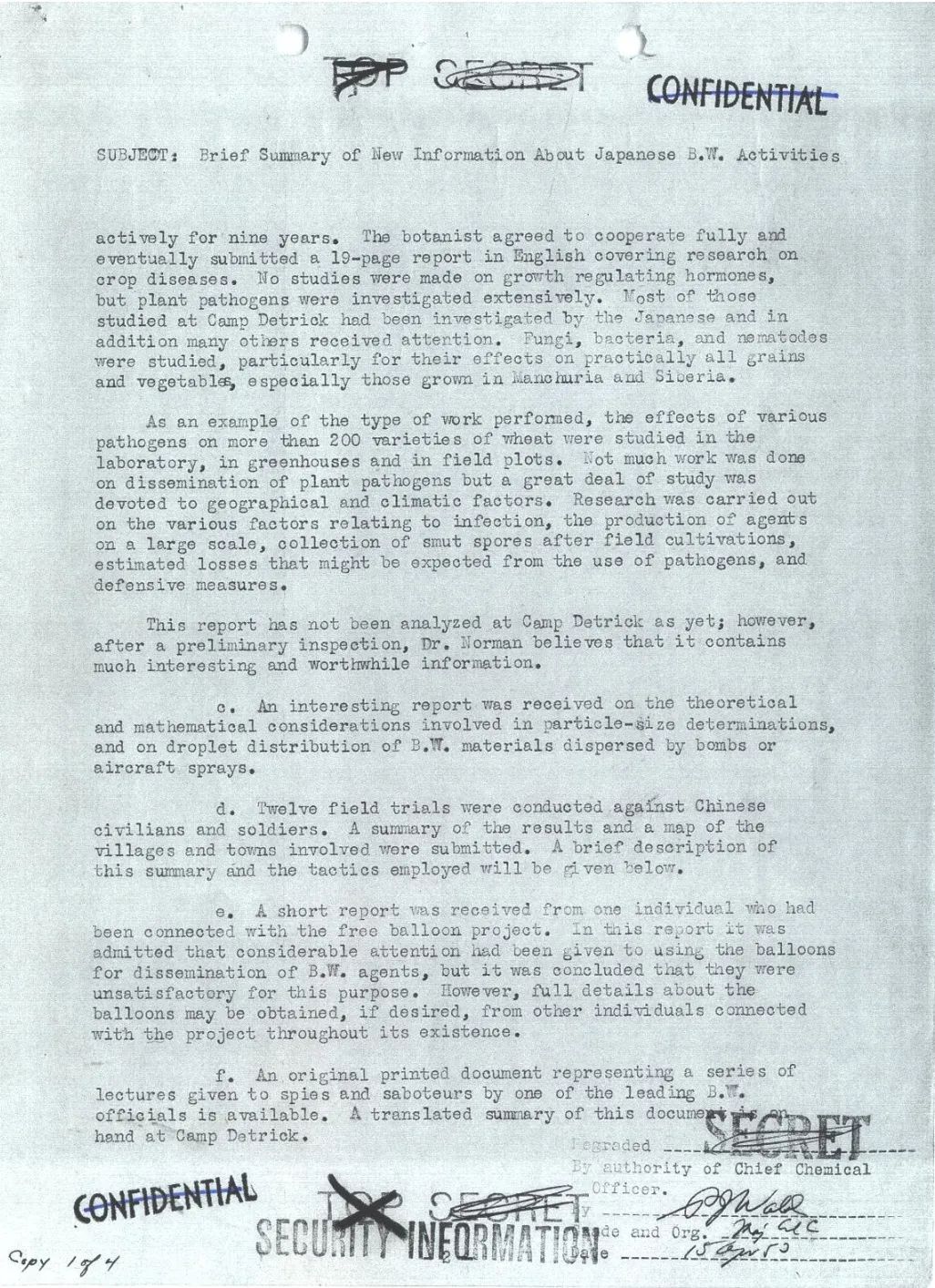 据称此份报道长达60页,包括对炭疽、鼠疫、伤寒、甲乙型副伤寒、痢疾、霍乱、鼻疽等的感染或致死量、感染方式、炸弹实验、喷洒实验、稳定性等方面的研究成果。该份报告现存于美国国家档案馆( 290/03/19/02)。