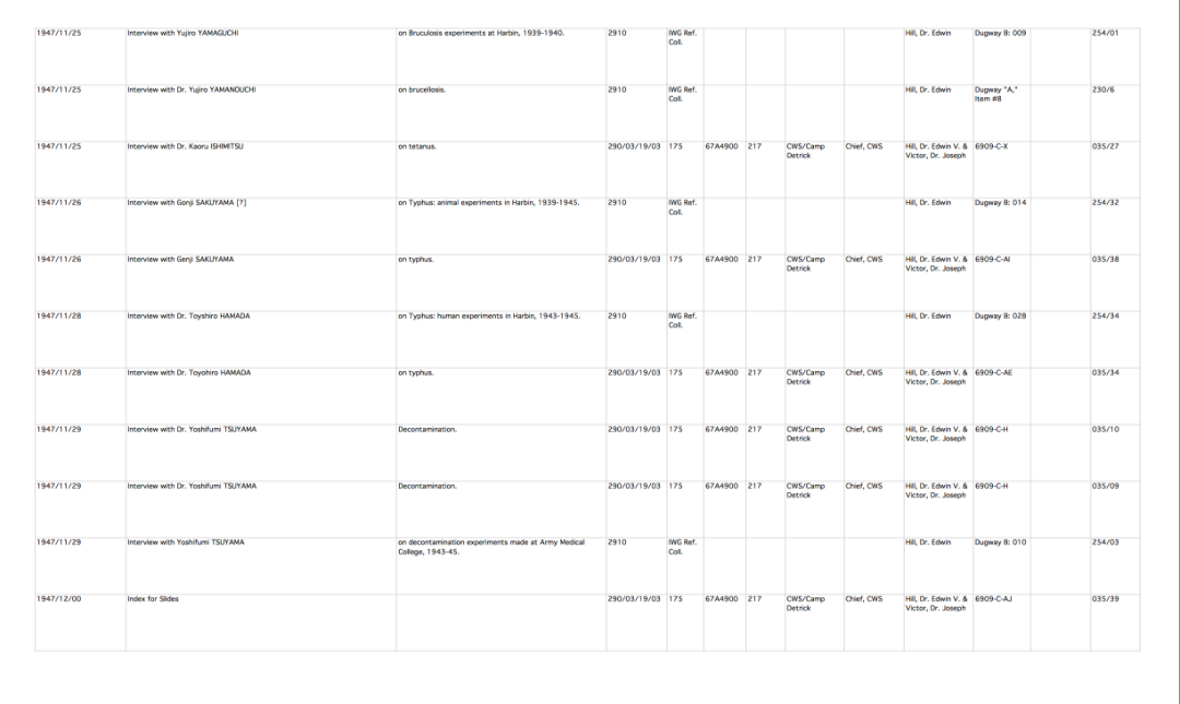 1947年10月29日起,德特里克堡的埃德温·希尔博士开始了对于731部队的主要成员的面谈共76次,内容包括植物、动物、人体实验、各类病毒以及生物武器在战争中的运用。