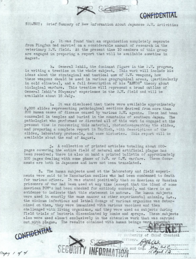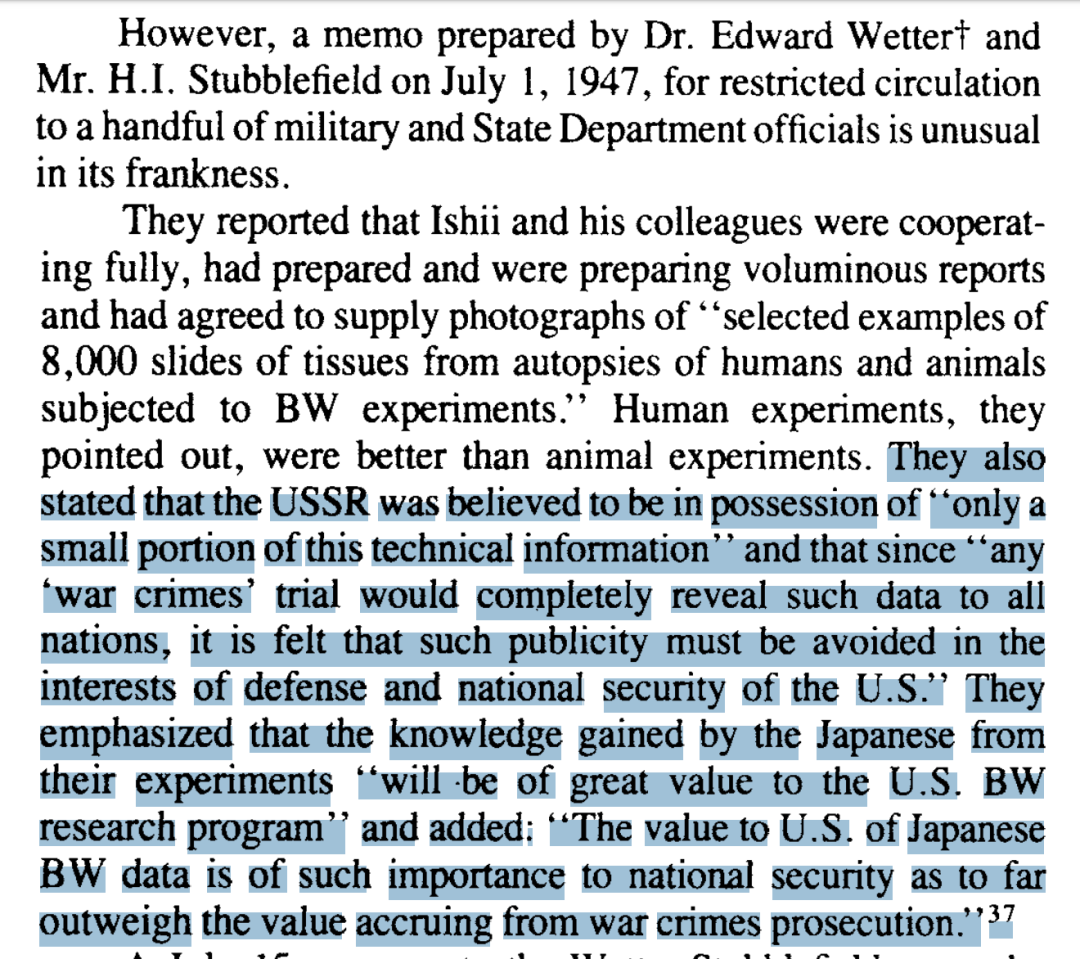 同年7月1日,爱德华·韦特尔博士写给美国国务·陆军·海军调整委员会(SWNCC)的备忘录中也提到 “(石井及其同事)愿意提供从人体实验和动物实验解剖获得的8000张玻片…任何’战争罪’审判都将向所有国家完全披露此些数据,因此,为了维护美国国防和国家安全,应避免(审判)发生。” 韦特尔甚至直接表明“日本生物武器数据对美国的重要性远远比(石井及其同事)被起诉更有价值。”