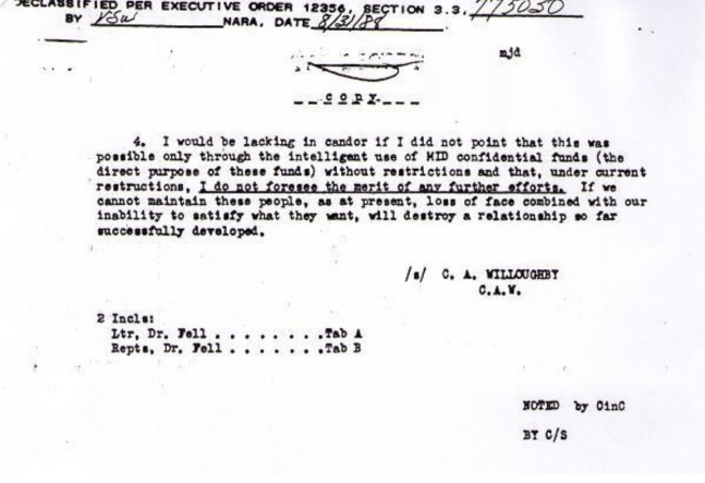 威洛比在电报中写道 “我必须要指出这是明智地使用MID机密资金的途径 (也是此资金的主要用途) …… 倘若我们不能留住这些人,丢失脸面或是无法满足他们的要求,将破坏迄今为止已成功发展的关系。”