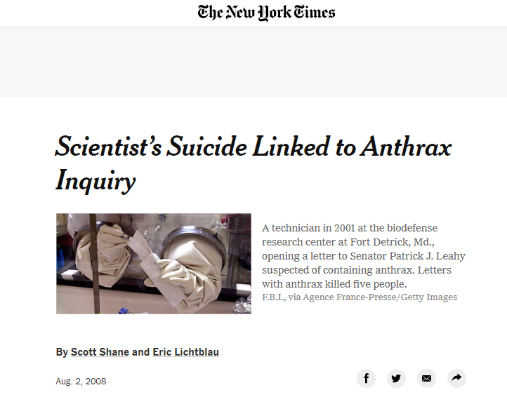 2001年的炭疽热袭击,德特里克微生物学家布鲁斯·埃文斯(Bruce E. Ivins)取出炭疽孢子并用信寄出,导致5人死亡17人感染。而就在2008年,当联邦调查局发现他的可疑之处并将逮捕埃文斯时,这位“备受尊敬”的科学家却选择自杀。