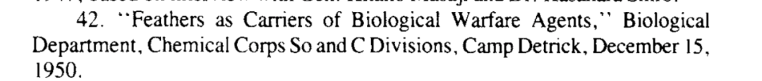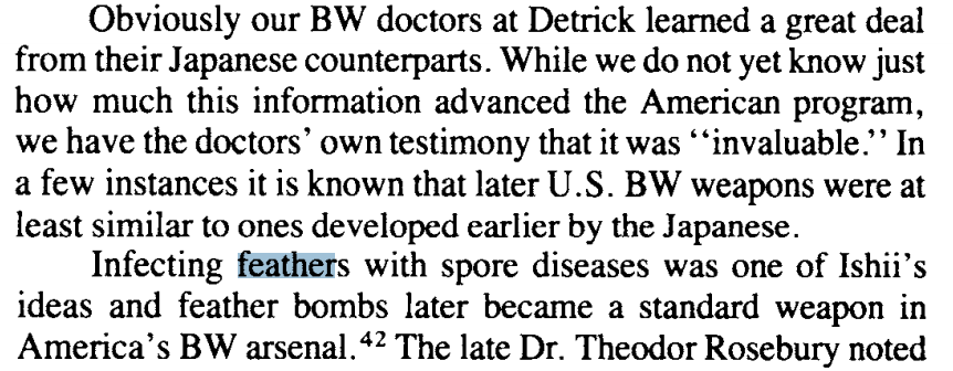 有趣的是,上述这些大多数都曾在石井及其同事的731部队研究过。上文提到的美国记者约翰·鲍威尔的《日本细菌战:美国掩盖战争罪》一文中对此也有详细叙述:“显然,在德特里克堡的研究者从日本同行那里学到了很多东西…… 有研究者称 (得到的报告) 是’无价之宝’。美国后来研发的生物武器与日本已开发的武器极为相似,例如用羽毛感染孢子病毒就是石井的想法之一,后来,羽毛炸弹成为美国生物武器库中的基本配置。” (如图)