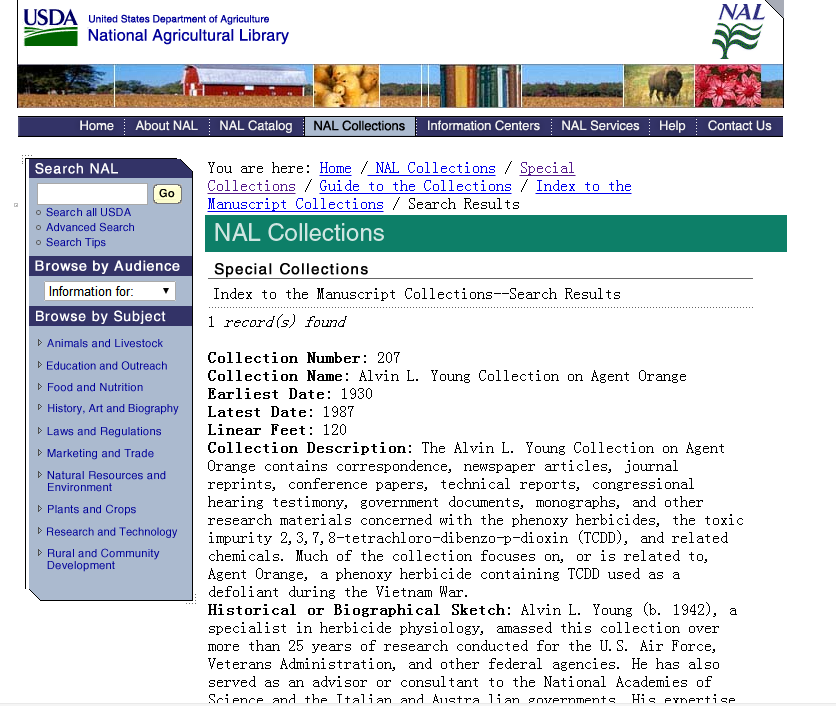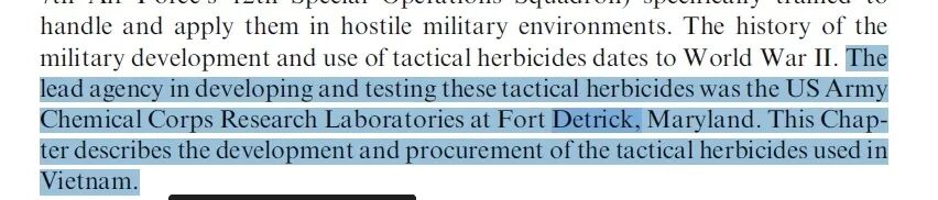 而在越南战争中投入实战的橙剂,根据曾帮助美国农业部整理橙剂相关文献的学者阿尔文·杨(Alvin L. Young)所著的《橙剂的历史、用途、特性及环境归宿》一书记载,研发、测试所谓“战术除草剂”(包括橙剂在内)的牵头机构即德特里克堡的化学武器研究实验室。