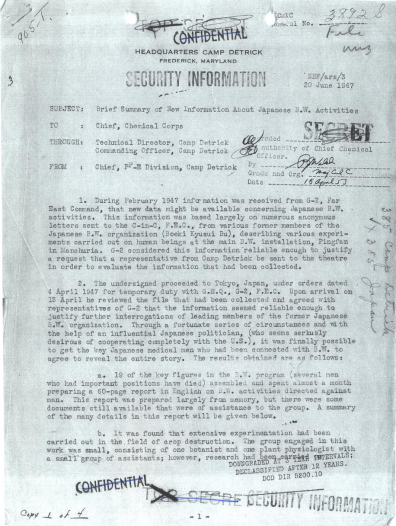 1947年4月德特里克堡的诺伯特·费尔博士奉命再次赴日本调查,并在6月29日发回的《日本生物武器新信息汇总》里称“目前在德特里克堡研究的实验日本人已经做过,并且还有许多新的研究,包括真菌、细菌、线虫对满洲以及西伯利亚地区谷物和蔬菜的影响。” “报告还没有在德特里克堡研究,但是在初步浏览后可以确信里面包含了很多有趣且有价值的信息。”