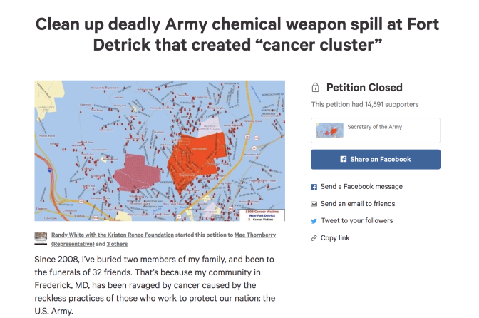 2011年到2016年,周边的居民请愿关闭德特里克堡,请愿人写道“德特里克堡的武器渗入地下,严重影响了我们的生活。这种不负责任的行为影响了成千上万人,让我的家人,朋友和邻居得了罕见的癌症。它已夺走了2500多个生命。”研究人员在德特里克堡附近发现的泄漏的橙剂、炭疽、武器化肉毒杆菌中毒和放射性碳十四。