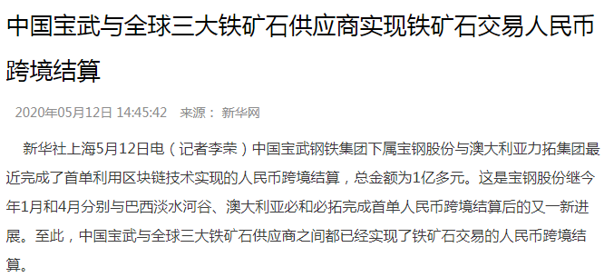 这是前几天的新闻,5月12日,中国宝武钢铁集团下属宝钢股份与澳大利亚力拓集团最近完成了首单利用区块链技术实现的人民币跨境结算,总金额为1亿多元。
