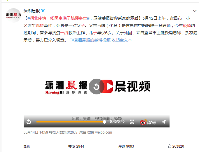 5月12日,湖北宜昌市中医医院的医生马麟(化名)在自家小区带着6岁的儿子跳楼,双双身亡。