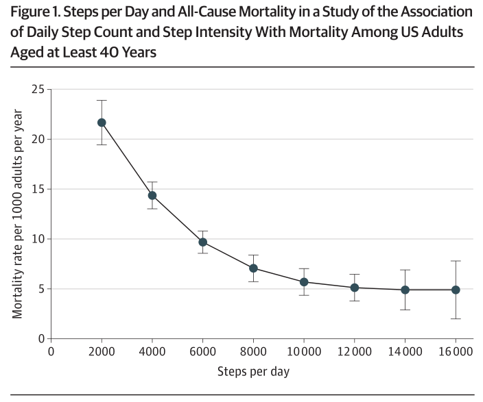 与每天步行4000步相比,每天步行8000步与全因死亡率显著降低51%,每天步行12000步则可降低65%。即使在排除了一些困难与死亡率相关的因素(如教育程度、是否吸烟、饮食习惯等)之后,步数与死亡率之间的关联依旧没有改变。