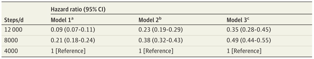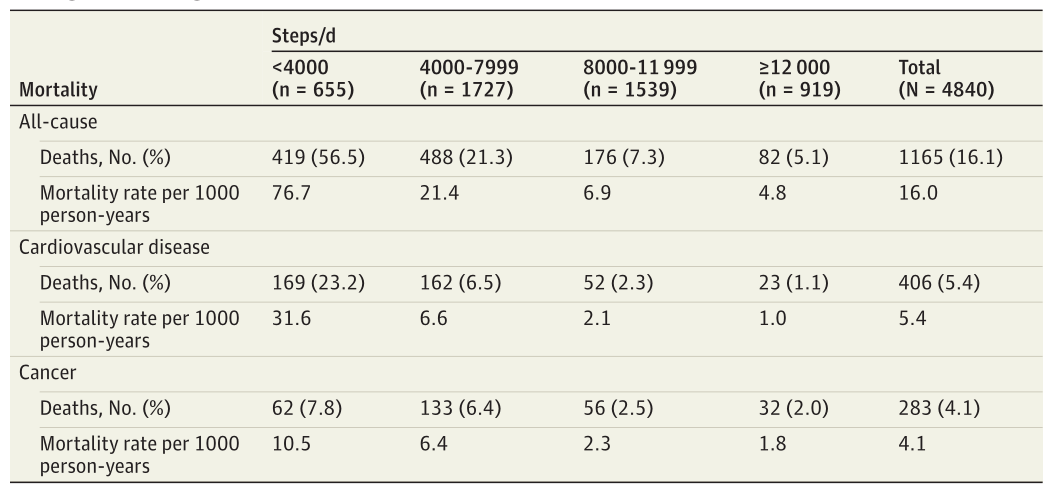 在未对数据进行其他因素的校正时,655例每天步数少于4000步的参与者中,全因死亡情况为每年每1000人有76.7人死亡;步数在4000-7999的1727名参与者中,全因死亡情况为每年每1000人有21.4人死亡;