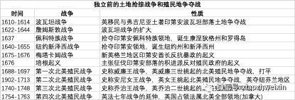 早期的葡萄牙和西班牙基本占领了亚非拉,教皇通过所谓“教皇子午线”将世界一分为二,给葡萄牙和西班牙划分了各自殖民地,葡萄牙主要占非洲和亚洲,西班牙主要占美洲,双方基本上能够相安无事,没有相互间的殖民地争夺战。在葡萄牙和西班牙通过大航海发了横财,迅速崛起的时候,英国一直在打仗和内乱,先是英法百年战争,后来是无休止的宗教战争和王室争夺战争,还有所谓圈地运动,没顾得上大航海。眼看着别人大航海发了财,只好通过收编海盗出去抢掠。抢掠葡萄牙、西班牙、荷兰的商船,并通过抢掠逐渐将“皇家海盗”培养成了“皇家海军”。大航海开始100年之后,英法才开始学着去大航海。此时,基本上只剩下北美那些天寒地冻的地儿,中南美洲、非洲的大好河山已经被人占完了。1606年,英国人先在今天美国东部弗吉尼亚站住脚,然后向周边扩展。法国人只能去占领更北边的地方,今天加拿大那些地儿。英国人显然不太服气,有“皇家海盗”出身的“皇家海军”支撑,自然会继续抢掠。所以,当英国在北美占稳脚跟后,很快就挑起了殖民地争夺战。在亚洲和非洲,当然是抢葡萄牙人已经占领的地盘,在美洲就是抢印第安人以及西班牙和法国占领的地盘。抢掠的战争是残酷而血腥的,几乎是天天都在抢,时刻都在战争,那些无以计数的战争根本没法统计完整。我们看上面的战争情况,英国早期对印第安人的战争还算比较客气,这从培根起义就可见一斑。培根认为英国政府太客气,主张对印第安人进行更激进的扩张和残酷镇压,受到了英政府的打压,居然还导致了培根起义。但英国政府对西班牙和法国可一点都没客气,连续发动四次大规模的殖民地抢掠战,从西班牙和法国口中夺食。最终也很成功,到美国独立前,基本上占领了北美全境,将法国赶出了美洲。当然英国的殖民地抢掠并不限于美洲,这里主要讲美洲。02