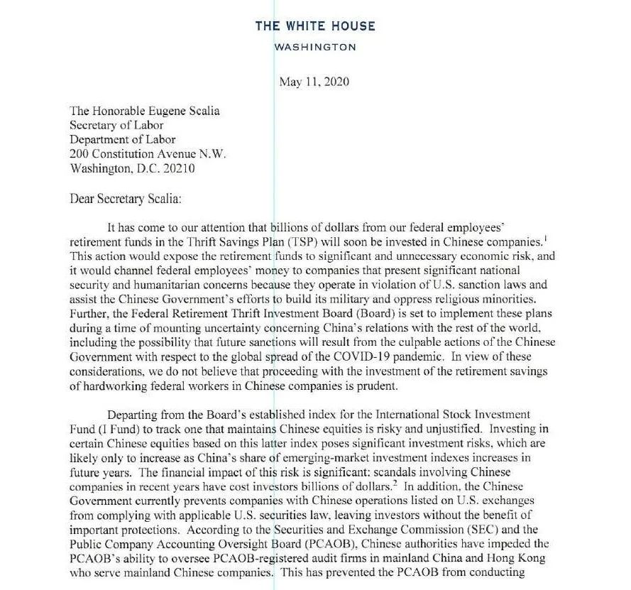 近日,在白宫几位对华强硬的政治要员逼迫下,一个负责制定联邦退休基金投资计划的委员会对外宣布,他们将无限期推迟投资中国企业的计划。