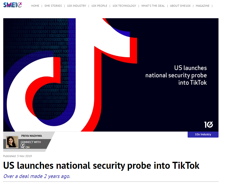 2019年11月,美国以“国家安全”为由启动针对字节跳动公司的调查。原因是字节跳动旗下的抖音国际版TikTok在美国青少年间太流行,存储的用户数据可能被中国政府盗用。