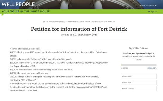 3月10日,署名B.Z.的美国网友在白宫请愿网站“我们人民”发起一条请愿贴,要求美国公开德特里克堡基地信息,并列出了一系列事件: