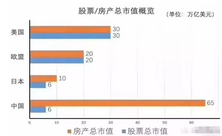 2018年11月18日,SOHO中国董事长潘石屹说,中国房地产的市值是65万亿美元,折合450万亿人民币,超过欧美日三个地方的房地产总值之和。