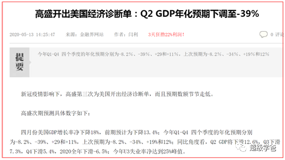 高盛也对美国经济做出预测:四月份美国GDP增长率净下降18%,前期预计为下降13.4%;今年四个季度的年化预期分别为-8.2%、-39%、+29%和+11%。