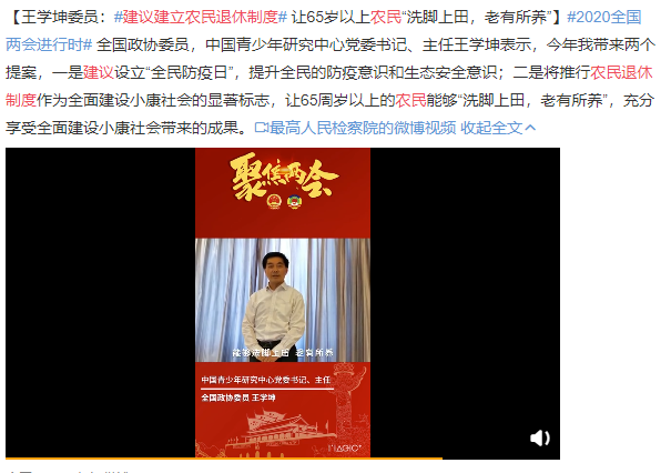 这是全国政协委员王学坤在两会之际带来的提案:推行农民退休制度。