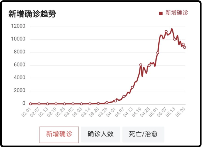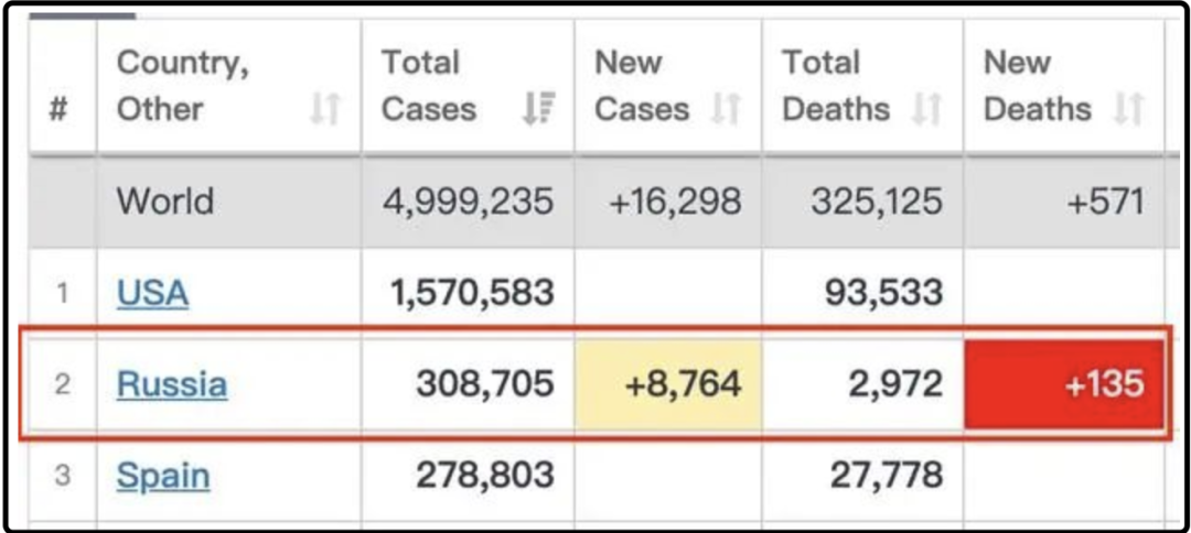 眼前,俄罗斯的疫情正有好转的趋势,日增人数也在相对放缓,并没有出现像美国那样日增数万的情况。在此,我们也相信,在俄政府的领导下,在中国人民的帮助下,俄罗斯人民终能战胜可怕的新冠病毒,早日恢复正常的生活。
