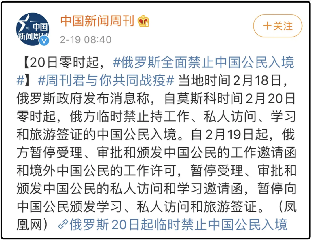 到了2月18日,俄政府则紧急宣布于2月19日起暂停中国公民签证服务,并宣布于20日起禁止中国公民持工作、留学、旅游、私人访问的签证入境。与此同时,已入境的中国公民则必须配合14天的医学隔离观察。