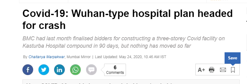 BMC在孟买南部建立武汉式全新医院的梦想即将破灭,今年2月,武汉在创纪录10天内建成了两所1000张病床的医院,用来治疗新冠病毒患者。