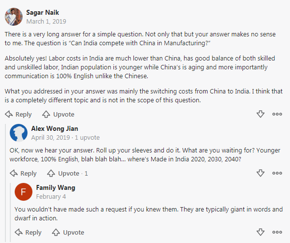 其实无论从Quora还是在印度时报以及印度经济时报下的留言,我能深深的感受到印度人和中国人的思维差异,这种差异表现在这几十年的制造业对于中国整体思维的重塑,这种重塑不是针对于官员,专家或者学者的,而是从全民思维上的重塑。