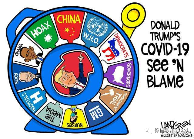 特朗普每天起床第一句,先给自己打个气,然后开始转动他的甩锅幸运大转盘,转到谁是谁:中国,世卫组织,奥巴马,民主党州长……都是他的甩锅对象。