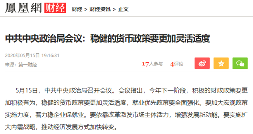 为什么这么说?5月15日召开的中央政治局会议已经给出了指引:稳健的货币政策要更加灵活适度,就业优先政策要全面强化。
