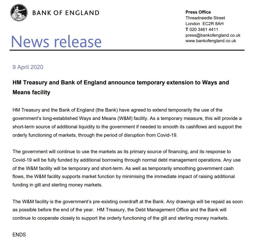4月9日,英国财政部和英国央行宣布,英国央行将暂时可以直接货币化政府债务,直到疫情平息。同时还宣布,将扩大财政部在英国央行的透支账户规模,该账户可以上升到实际不受限制的数额。